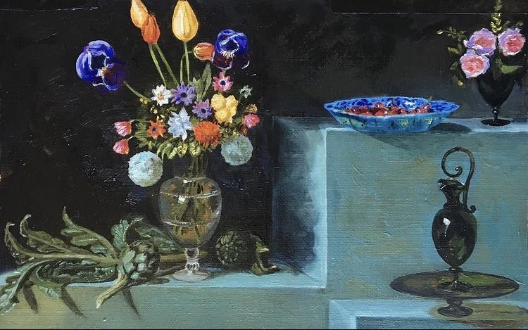 Ik houd van het bestuderen en kopiëren van werk van Oude Meesters - een klassieke studiestrategie en inspiratiebron. Daarvoor gebruik ik uitsluitend olieverf, net als de Oude Meesters zelf deden.